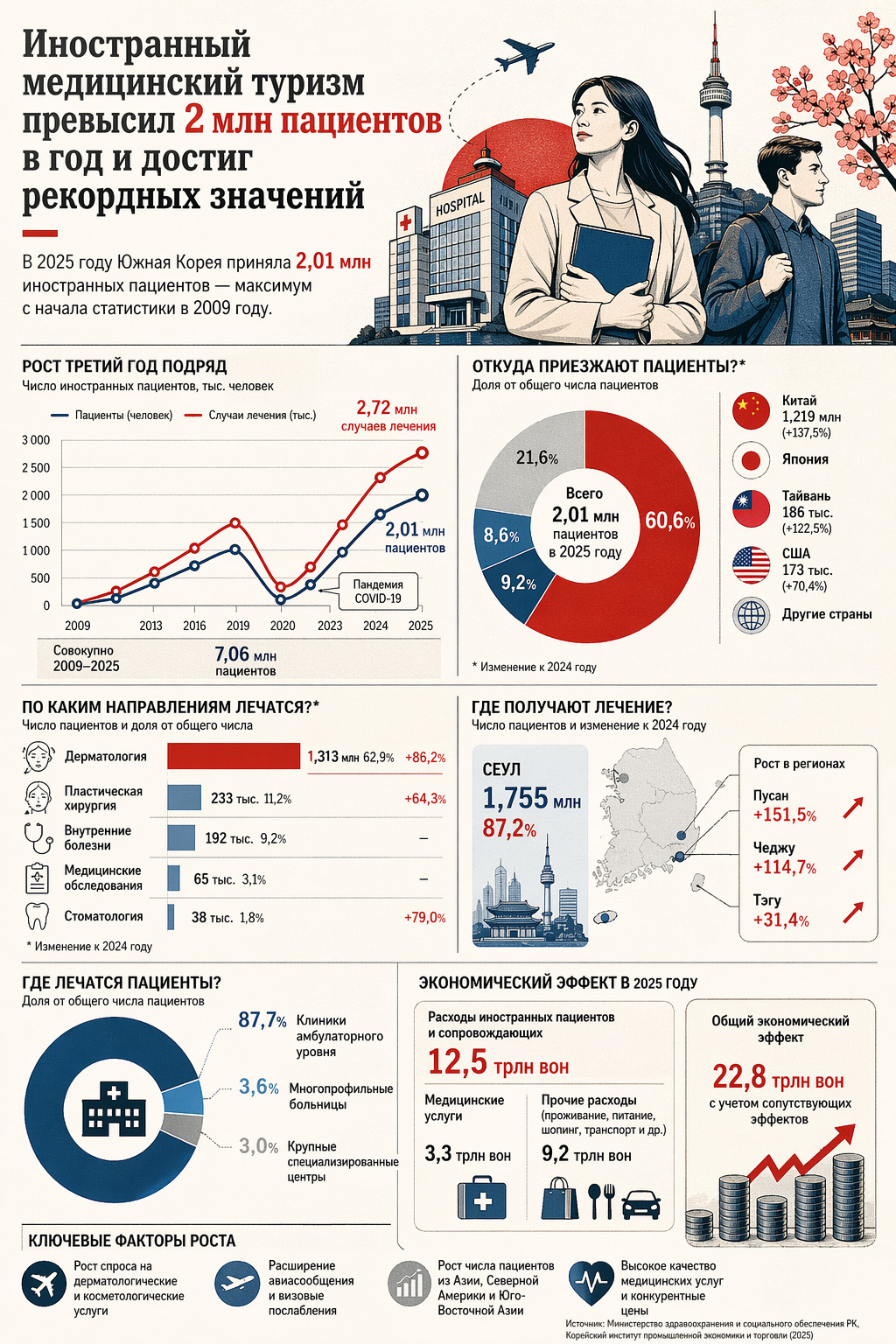 По данным Министерства здравоохранения и социального обеспечения Республики Корея, в 2025 году медицинские учреждения приняли 2,01 млн иностранных пациентов (2,72 млн случаев лечения), что стало максимальным значением с начала ведения статистики в 2009 году. Совокупное число иностранных пациентов за этот период достигло 7,06 млн.